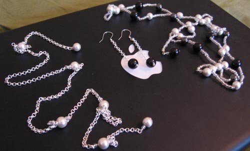 Eli hopeanvalkoisia ja tumman metallinkiiltoisia 8 mm magneettihelmiä, 10 mm mustia lasihelmiä, 3 mm kirkkaita lasihelmiä, valmista hopeapinnoiteketjua. Korviksissa lisäksi koukut 0,6 mm hopealankaa (ihku ekat itsetekemäni koukut, oli helpompaa, kuin luulin. :)) ja 2 mm hopeahelmiä.