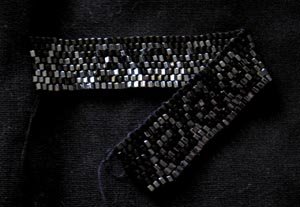 Kuvan kontrastia on lisätty, että kuvio näkyisi paremmin. Helminä on kuusikulmainen pikkuhelmi, joista tuli ihanan tasaisen kiiltävä pinta. Toinen helmi oli musta ja toinen metallikiiltoinen musta, joten rannekoru (lukko vielä uupuu) näyttää oikeasti miltei mustalta, paitsi kun valo osuu oikeasta kulmasta. Oli aika näpertely, kun ei itsekään välillä meinannut erottaa helmiä toisistaan. :)