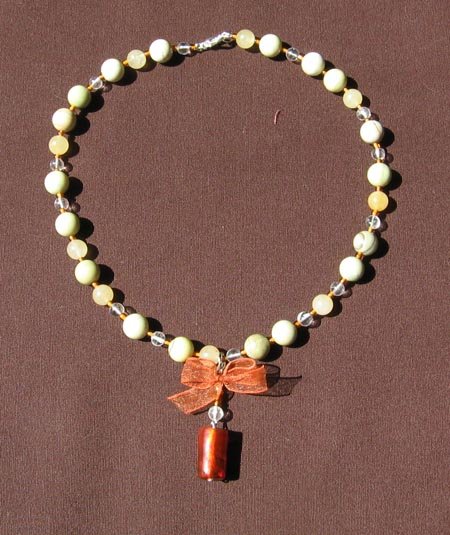 Koruvaijeriin tehty, jadea, vuorikristallia ja jotain kellertäviä kiviä mitä tuli kiitoskivinä joskus. Väleissä rusehtavat lasihelmet ja riipuksessa organza rusetti ja välihelmien sävyyn sopiva foliolasihelmi.